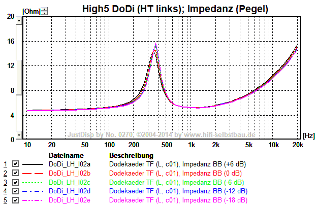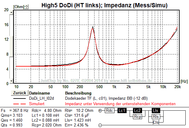 Die 12 Breitbänder haben in dem ca. 1 Liter großen Dodekaeder eine Resonanzfrequenz von 368 Hz bei einer Gesamtgüte von knapp 1. Es sind darüber hinaus keine Impedanzstörstellen erkennbar.