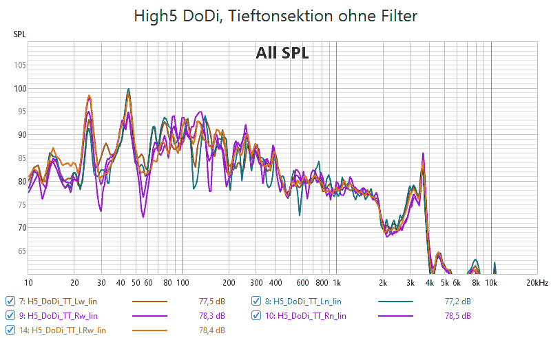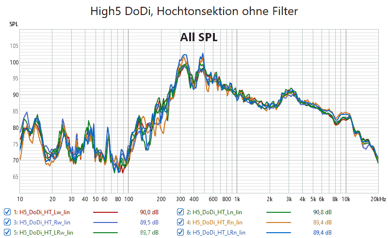 Die räumliche Mittelung um den engeren Hörbereich (sitzend) und über einen breiteren Bereich (sitzend und stehend) ergibt weitgehend gleiche Ergebnisse. Dies gilt auch für die Messung der einzelnen Kanäle und beider Kanäle (- 3dB). Die einzelnen Sektionen sind offenbar wenig richtungs- und hörplatzabhängig und die energetische Summation (0 dB + 0 dB = +3 dB) funktioniert gut - damit ist das Entwicklungsziel erreicht!!!
