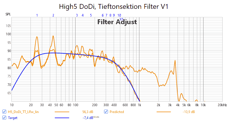 Basierend auf den Messungen mit beiden Kanälen und breiter räumlicher Mittelung (Index LRw) wurden in REW passende Filter simuliert: