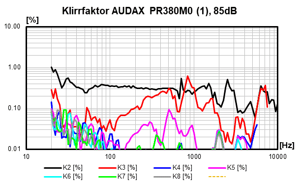 Die Klirrkomponente K2 verläuft bis 1.6 kHz weitgehend linear und steigt moderat mit dem Anregungspegel. Der unharmonische K3 hat ein Maximum um 850 Hz (= 1/3 der Membranresonanz) und steigt etwas weniger mit dem Anregungspegel als K2. K5 zeigt bei Pegeln bis 95 dB und 20 cm Messabstand ein Maximum um 520 Hz (= 1/5 der Membranresonanz). Ab 105 dB spielen auch die übrigen Klirrkomponenten eine Rolle. Bei 110 steigen die Klirrkomponenten deutlich an.