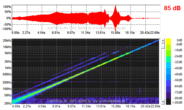 Nach unseren Untersuchungen (Klirrfaktor - wie viel ist zu viel?) lägen alle Klirrkomponenten bis 100/105/110 dB über 38/42/42 Hz unterhalb der Wahrnehmbarkeitsschwelle. Der unharmonische K3 läge zwischen 501 und 1679 Hz (85 bis 95 dB) bzw. 596 und 1059 Hz (100 dB) bzw. 794 bis 1059 Hz (darüber) oberhalb der Wahrnehmbarkeitsschwelle für Sinustöne. Für K5 gilt dies zwischen 447 und 1059 Hz (85 bis 105 dB) bzw. nur bei 562 Hz (110 dB).