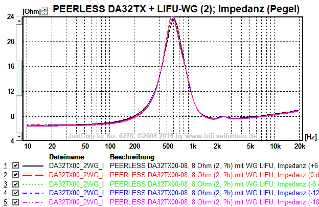 Bei der pegelabhängigen Impedanz erhöht sich der Gleichstromwiderstand bei Änderung des Anregungspegels von -18 auf +6 dB um 0.1 Ohm, das sind nur 1.5%.