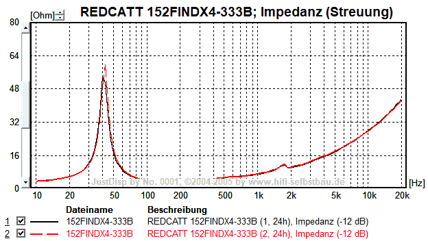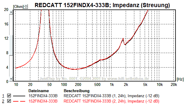 Im Impedanzverlauf ist um 600 Hz eine "kleine" und um 1.8 kHz eine "große" Störungen erkennbar, die sich beide im Schalldruck-Frequenzgang wiederfinden.