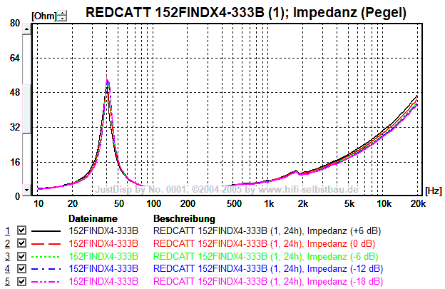 Die Resonanzfrequenz ändert sich nur um 3.6%, wenn man den Anregungspegel von -18 dB auf +6 dB (und damit die Eingangsleistung um den Faktor 256) erhöht - dies lässt sich zum einen durch die harte Einspannung und den damit verbundenen geringeren Hub erklären, ist aber auch ein erster Hinweis darauf, dass der 152FINDX4-333B "Nehmer-Qualitäten" hat . . .