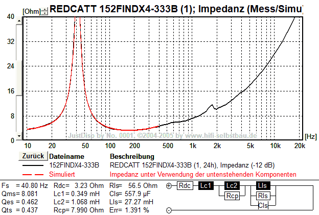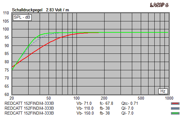 In einem 71 Liter großen, geschlossenen Gehäuse ergibt sich eine Gesamtgüte von 0.71 und eine untere Grenzfrequenz von 68 Hz - da ist der 152FINDX4-333B wohl eher eine Fehlbesetzung . . .