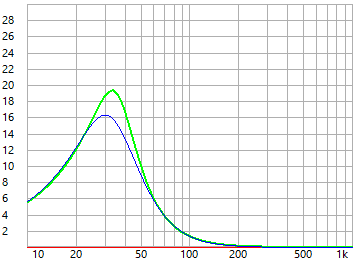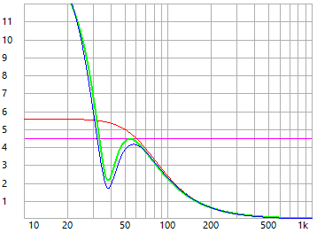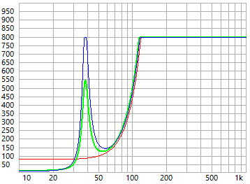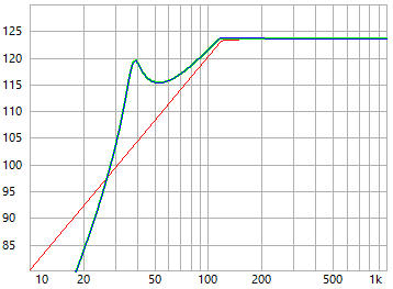 - beide Bassreflex-Abstimmungen würden bei 125 Watt unter 33 Hz (grün) bzw. 32 Hz (blau) den linearen Auslenkungsbereich verlassen - hier sollte ggf. ein Hochpassfilter die Auslenkung begrenzen