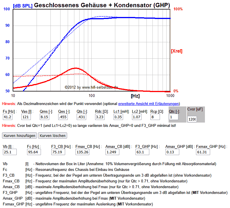 Hat man nur 25 Liter zur Verfügung ergibt sich im geschlossenen Gehäuse eine Gesamtgüte von 1 - mit einem Vorkondensator von 1200 uF geht es dann bis 63 Hz runter: