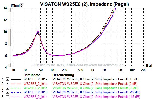 Die Streuung der TSPs ist noch gering. Die fehlenden Hinterlüftungsmaßnahmen bescheren dem WS25E eine mechanische Güte Qms von nur 1.89 - VISATON gibt 2.82 an. Die elektrische Güte Qes wird mit 2.81 ganz gut getroffen (VISATON: 2.92). Hier noch der Vergleich der anderen TSPs: