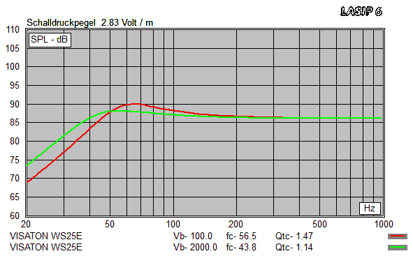 Lasip empfiehlt gar nix - der Qts-Wert ist eigentlich für alle Gehäusevarianten zu hoch. In einem 2000 Liter (max. Eingabewert) großen, geschlossenen Gehäuse geht es bis 32.8 Hz runter (mit einer Überhöhung um 2.05 dB bei 55.9 Hz), in 100 Litern "nur" noch bis 39.7 Hz (mit einer Überhöhung um 3.87 dB bei 64.4 Hz).