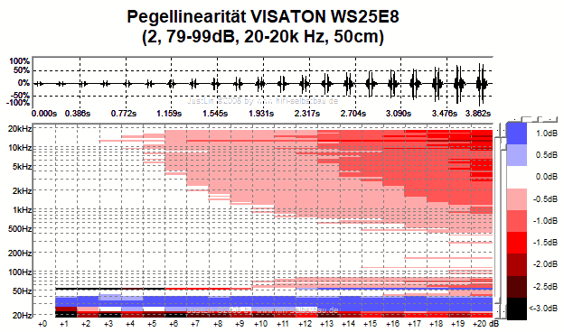 Bei einem Schalldruck von 79 bis 99 dB (das entspricht einer Anregung mit 1.22 bis 12.2 Volt bzw. 0.26 bis 26 Watt) zeigen sich unterhalb von 800 Hz nur ganz sporadisch Nichtlinearitäten > 0.5 dB, wobei diese zu höheren Frequenzen hin zunehmen (bei 2 kHz schon ab 95 dB). Bei Steigerung des Anregungspegels um 6 dB (bzw. Vervierfachung der Eingangsleistung) sind um 150 Hz (= Impedanzminimum) und < 80 Hz Kompressionseffekte > 1 dB ab 102 dB (85 + 17 dB) zu erkennen. Bei der letzten Pegelstufe sind breitbandig Kompressionseffekte zu sehen - hier (Eingangsleistung 100 Watt) ist das Chassis passend zur elektrischen Belastbarkeit am Ende . . .