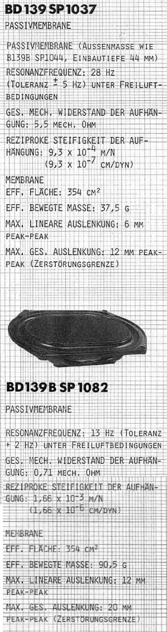 | Besonderheiten: | Breitbänder mit 102 mm durchmessender Aluminium-Membran und Ledersicke 38 mm durchmessende Unterhang-Schwingspule statt einer Zentrierspinne gibt es 3 tangentiale Beryllium-Kupfer-Federn (von denen 2 auch gleich die Stromzufuhr übernehmen) die "Staubschutzkalotte" der Aluminium-Membran hat ein 19 mm großes Loch, das von innen mit Schaumstoff abgedeckt ist |