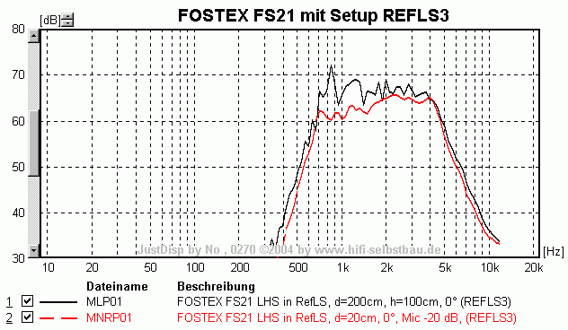 Damit ergab sich der folgende Frequenzgang in 20 bzw. 200 cm Entfernung (bei der 20cm - Messung wurde das Mikrofonsignal um 20 dB abgeschwächt um die Pegelerhöhung zu kompensieren):