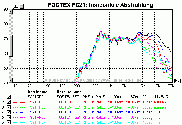 ->+/- 8.5° vertikal (= +/- 15cm) ist die Abstrahlung des FOSTEX FS21 bis etwa 5 kHz sehr gleichmäßig. Horizontal fängt der FS21 bereits ab 2500 Hz zu bündeln an. Bis +/- 15° hält sich die Bündelung aber bis 5 kHz in Grenzen.