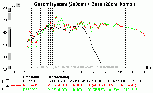 Bleibt nur noch der Bass! Tja, und da es sich um wirklich gute Bässe handelt, die mit einer Trennfrequenz von ca. 650 Hz kein Problem haben, gestaltete sich dieser Teil recht einfach! Im folgenden Bild wird der Gesamtfrequenzgang der Kombination mit und ohne Bassanhebung ("Treppenstufe" LP12 bei 50 Hz mit 6 dB Anhebung) mit dem Frequenzgang der Basschassis über Weiche im Nahfeld (20 cm Abstand, zwischen den Chassis) verglichen: