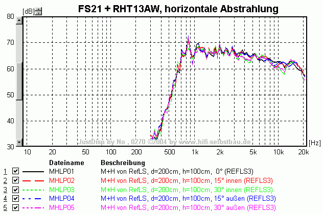 ->Bis +/- 15° horizontal ist die Abstrahlung sehr gleichmäßig, bei +/- 30° zeigen sich die aus der Messung der Einzelchassis bekannten Bündelungseffekte!