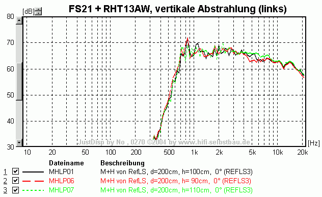 In größerer Entfernung ergab sich dadurch aber - bedingt durch die schon bei 2500 Hz einsetzende horizontale Bündelung - bei ca. 3 kHz ein kleines "Loch", das durch einen parametrischen Equalizer (Bandpass bei 2850 Hz, Q=4.0, +3.0 dB) "behandelt" wurde.