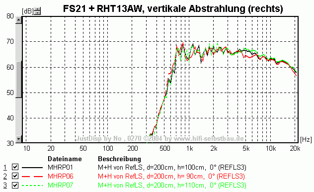 Die Kombination beider Chassis zeigen die folgenden Bilder (der Hochtöner musste übrigens um 3.0 dB angehoben werden). Aufgrund der großen vertikalen Ausdehnung der beiden Chassis (ca. 50cm vom unteren Rand des FS21 zum oberen Rand des RHT13AW, über 100cm wenn auch noch die Bässe mit dazu gerechnet werden) wurde der Messabstand auf 200 cm vergrößert. In dieser Entfernung misst man in einem "normalen" Hörraum bereits im Diffusfeld. Durch die mit der Frequenz zunehmende Absorption aller reflektierenden Flächen ist daher ein leicht abfallender Frequenzgang anzustreben (je nach Abstand und Absorption 1 bis 1.5 dB pro Oktave). Alle Messungen wurden übrigens im "alten" Hörraum der Redaktion durchgeführt, wobei die Bodenreflexion durch einen 200 · 60 · 15 cm großen Absorber aus Mineralwolle unterdrückt wurde: