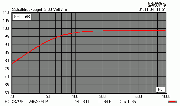 Durch eine 2. Impedanzmessung mit Zusatzmasse wurde aus der Resonanzverschiebung die Membranmasse zu 28.1 Gramm bestimmt und damit über die Membranfläche von 319 cm² ein Vas von 140.5 l errechnet. Mit diesen Parametern ergibt sich für ein geschlossenes Volumen von 80 l und 2 parallel geschaltete Bässe die folgende Simulation in LASIP: