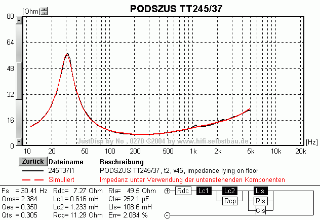Durch die beiden Basslautsprecher ist eine Nahfeldmessung auch nicht ganz einfach, so dass eine Simulation das Verhalten ohne Bassanhebung verdeutlichen soll. Folgende TSPs wurden durch eine Impedanzmessung an einem einzelnen Chassis ermittelt (Auswertung mit JustDisp im Menüpunkt "Berechnen / Simuliere Impedanz "):