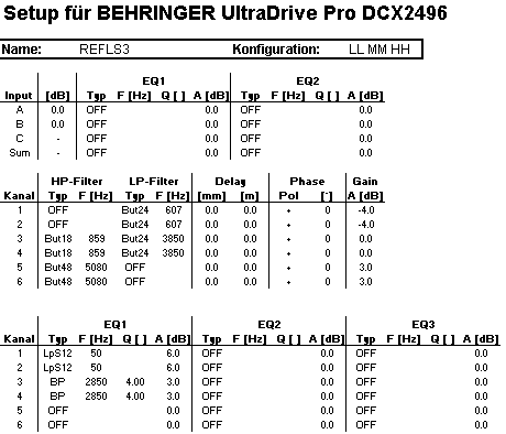 Zum Abschluss noch einmal die Aufstellung aller Einstellparameter des Setups für den DCX2496. An den dynamischen Limitern und Equalizern wurde übrigens im Sinne von "high fidelity" (= hohe Klangtreue) nicht "rumgespielt". Auch ein Verpolen der Chassis oder ein Zeitanpassung war dank der verwendeten Magnetostaten im Mittel- und Hochtonbereich nicht nötig.