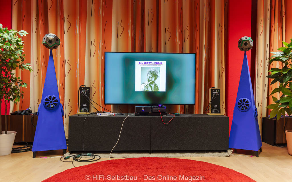 Damit die Tieftöner nicht stören wurden sie in einem Pyramidenstumpf untergebracht - einer auf jeder Seite. Und so sieht das Resultat dann in unserem Messraum auf der Drehplatte aus: