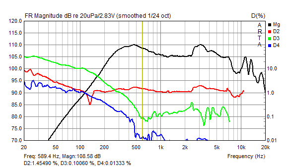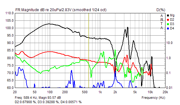 Vom Rundstrahlverhalten her könnte die Trennfrequenz zwischen Tiefton- und Hochtonsektion irgendwo zwischen 400 und 1000 Hz liegen - aber was sagt der Klirrfaktor dazu?