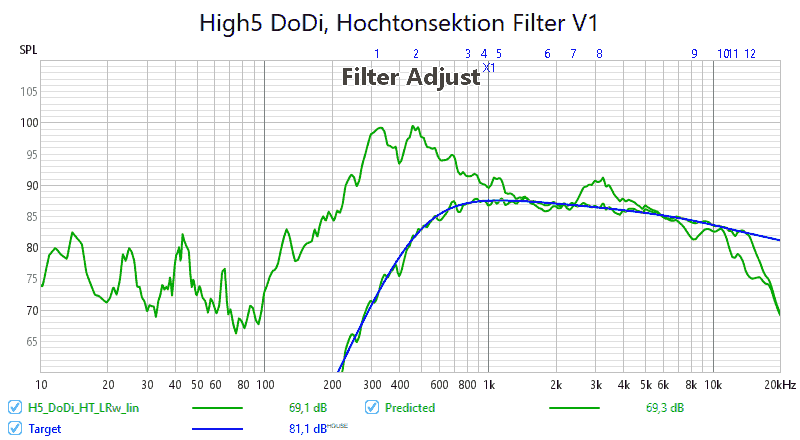 Basierend auf den Messungen mit beiden Kanälen und breiter räumlicher Mittelung (Index LRw) wurden in REW passende Filter simuliert: