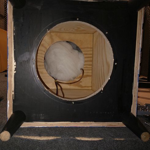 Normalerweise sollte bei einem Bassreflexsystem (mit oder ohne Passivstrahler) bei der Abstimmfrequenz im Nahfeld des Tieftöners ein Frequenzgangeinbruch auftreten - der hier aber nicht erkennbar ist. Möglicherweise ist der Bassreflexeffekt durch zu starke Absorption reduziert - beim Blick durch den demontierten Passivstrahler erkennt man eine starke Absorption im Bereich der Chassis: