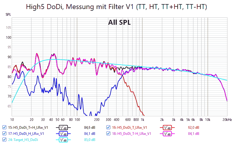 Die räumliche Mittelung um den engeren Hörbereich (sitzend) und über einen breiteren Bereich (sitzend und stehend) ergibt weitgehend gleiche Ergebnisse. Dies gilt auch für die Messung der einzelnen Kanäle und beider Kanäle (- 3dB). Die einzelnen Sektionen sind offenbar wenig richtungs- und hörplatzabhängig und die energetische Summation (0 dB + 0 dB = +3 dB) funktioniert gut - damit ist das Entwicklungsziel erreicht!!!