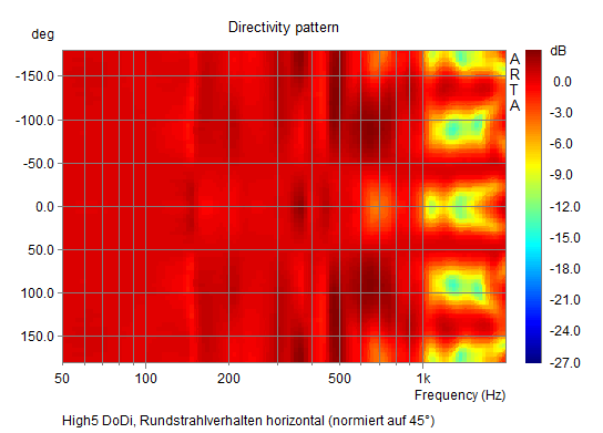 Das Rundstrahlverhalten der Tieftonsektion wurde in einem Abstand von 150 cm vom Mittelpunkt des Pyramidenstumpfs gemessen, 0° entspricht der Hauptstrahlrichtung des vorderen Tieftöners, die Höhe des Mikrofons wurde durch eine Senkrechte zum Pyramidenstumpf auf mittlerer Höhe der Tieftöner bestimmt: