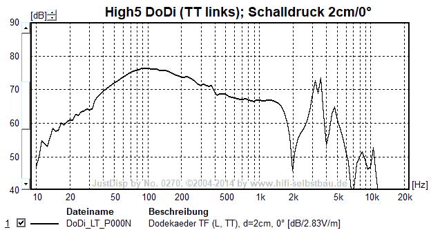 Die DoDi von High Five ist ein Rundumstrahler, der in der Mittel-/Hochtonsektion mithilfe von 12 identischen Chassis gleichmäßig verteilt auf einem Dodekaeder mit 8 cm Kantenlänge (-> Umkugelradius 11.21 cm) das Ideal einer atmenden Kugel nachbilden will. Dies funktioniert bis 3 kHz (Wellenlänge ca. 11.4 cm = Umkugelradius) auch sehr gut, darüber ist der Abstand der Chassis zu groß und das Rundstrahldiagramm bricht in 12 Spitzen bzw. Senken auf.