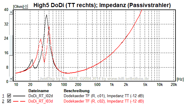 Im Anlieferungszustand (c01) war eine Zusatzmasse von 275 gr am Passivstrahler montiert, es ergab sich eine ziemlich tiefe Abstimmfrequenz von 26 Hz. Wenn man die Zusatzmasse entfernt (c02) steigt die Abstimmfrequenz auf 40 Hz - das ist also der Spielraum, der sich durch die Änderung der Zusatzmasse ergibt. Es sind darüber hinaus keine Impedanzstörstellen erkennbar.