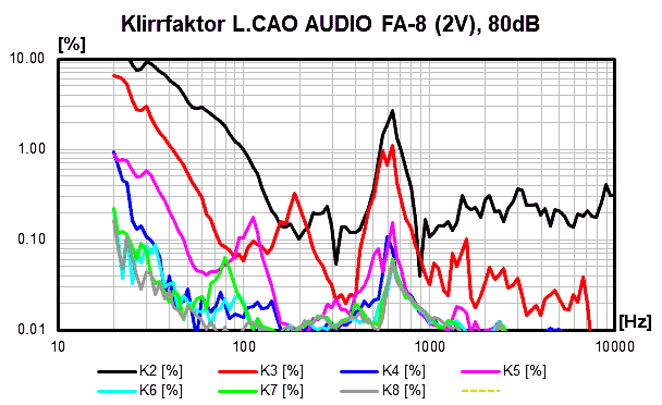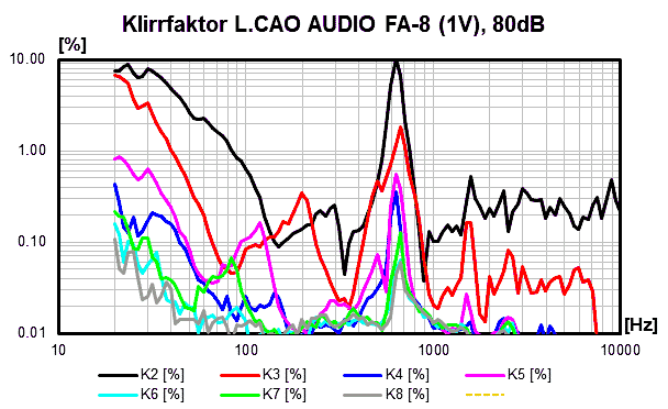 Entlastet man den FA-8 (mit einem Hochpassfilter 2. Ordnung bei 80 Hz) von tiefen Frequenzen, dann werden die Linearitätsfehler < 200 Hz deutlich entschärft, im Bereich um die Sickenresonanz verschlimmern sich die Nichtlinearitäten jedoch.