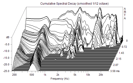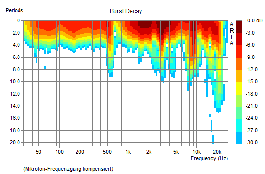 Das periodenskalierten Zerfallspektrum sieht sehr gut aus, selbst bei den Membranresonanzen 530 Hz, 3 und 9 kHz gibt es kein langes Nachschwingen.