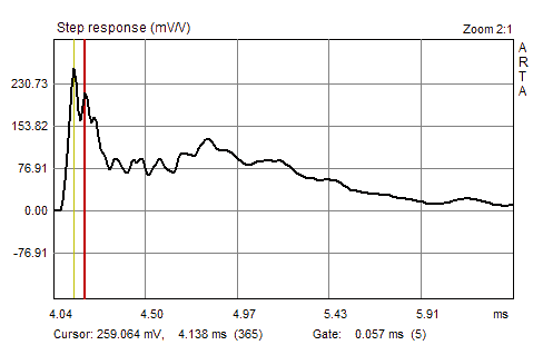Die Sprungantwort (20cm/0°) zeigt ein 2. Maximum ca. 0.057 ms später als das 1. Maximum. Dies entspricht einer Laufzeit von ca. 2 cm und könnte eine Reflexion am offenliegenden Polkern sein.