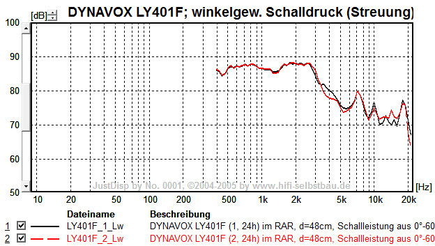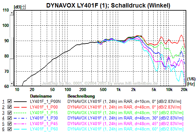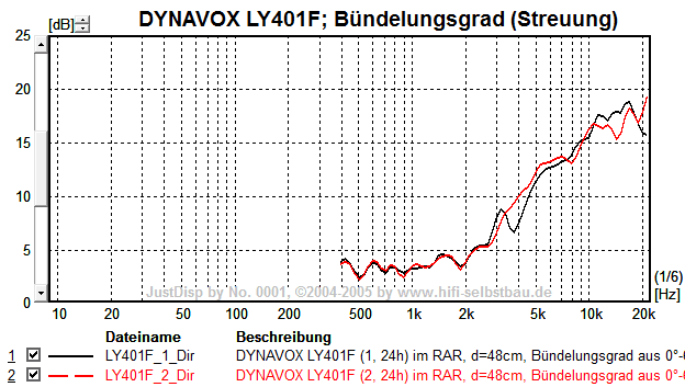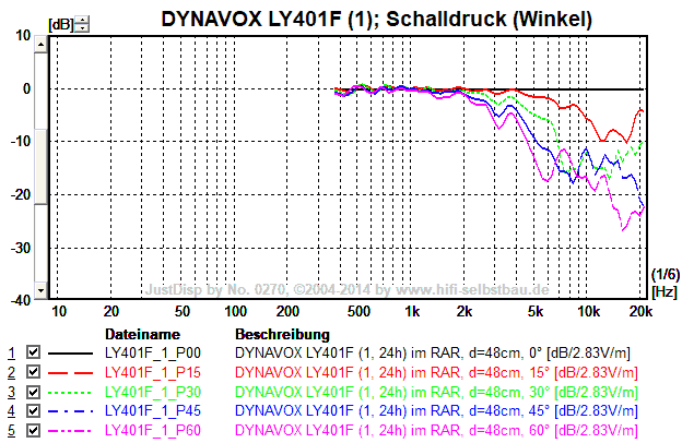Unter 15° verhält sich der LY401F bis 9 kHz ähnlich (nur ca. 3 dB leiser bei 9 kHz), aber ab 30° geht es schon ab 4 kHz deutlich bergab.