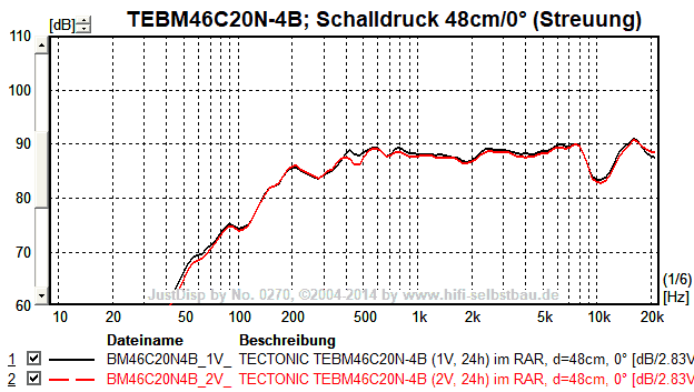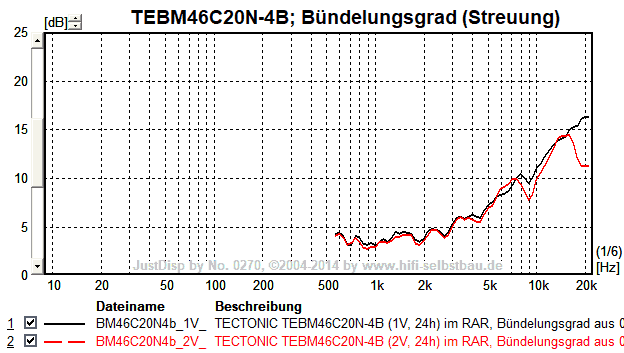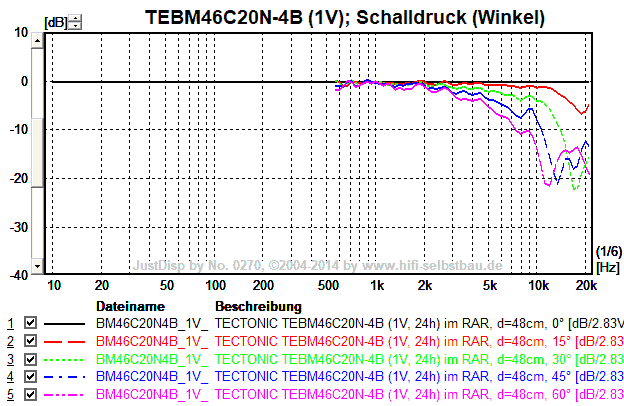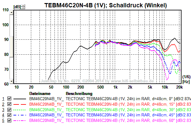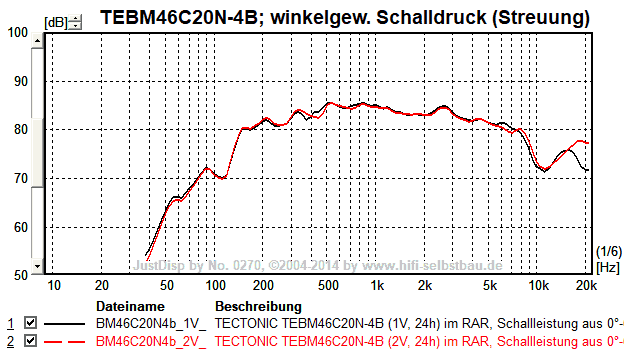 . . . verläuft von 400 Hz bis 8 kHz auf Achse weitgehend linear (Mittelwert 88.29 dB, Standardabweichung +/- 0.71 dB), unter 400 Hz fällt der Schalldruck TSP-bedingt ab (Fs = 163.4 Hz, Qts = 0.461 -> -6 dB bei 165 Hz). Zwischen 8 und 13.5 kHz gibt es eine ca. 6 dB tiefe Senke, dadurch klingt der TEBM46C20N-4B dezenter als vergleichbare Breitbänder, die in diesem Frequenzbereich oft eine ausgeprägte Membranresonanz haben und entsprechend "vorlaut" klingen. Oberhalb von 14 kHz fällt der Schalldruck kaum ab, bei 20 kHz werden (auf Achse) immer noch 87.9 dB erreicht!!! Unter 15° verhält sich das Chassis bis 11 kHz fast gleich (Abweichung zur 0°-Kurve < 1 dB), erst darüber steigt der Unterschied zur 0°-Kurve zunehmend an (ca. 6 dB bei 20 kHz).