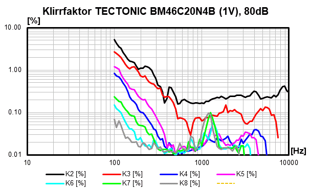 Die Klirrkomponente K2 zeigt oberhalb von 400 Hz ein weitgehend konstantes Verhalten und erhöht sich moderat mit dem Anregungspegel. Der unharmonische K3 verläuft bei 80/85/90/95/100 dB mittlerem Anregungspegel oberhalb von 500/750/1000/1250/1500 Hz näherungsweise linear und steigt darunter mit 9 dB/Oktave an. Ähnliches gilt für K5 und K7.