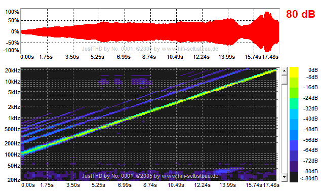 Nach unseren Untersuchungen (Klirrfaktor - wie viel ist zu viel?) wäre K2 oberhalb 125 Hz im untersuchten Pegelbereich unhörbar. Der unharmonische K3 liegt bei 80 dB oft zwischen 944 und 1334 Hz oberhalb der Wahrnehmbarkeitsschwelle (bei 85 dB von 473 bis 1334 Hz, ab 90 dB von 100 bis 1334 Hz). Ähnliches gilt für K5 (bei 80 und 85 dB nur sporadisch, ab 90 dB von 100 bis 1000 Hz). Ab 100 dB liegt noch K7 von 316 bis 668 Hz über der Wahrnehmbarkeitsschwelle.
