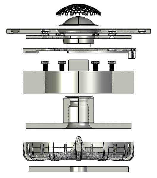 Die 3.6mm starke Aluminium-Frontplatte ist mit 6 Schrauben mit dem Magneten verschraubt und bietet auch 6 Befestigungspunkte für den Einbau ins Gehäuse - das wirkt fast schon martialisch . . . Allerdings steht die Differenz zwischen Frontplatten- und Magnetdurchmesser von 30 mm nicht überall zur Verfügung, denn für die Anschlüsse wird ein (Halb-) Loch mit 16 mm Durchmesser empfohlen, so dass dort nur noch 7 mm Auflagefläche zur Verfügung stehen - da machen dann 6 Befestigungspunkte wieder Sinn . . .