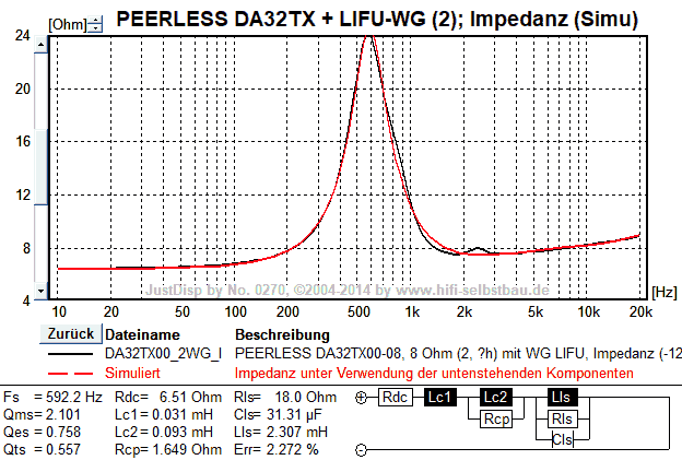 Die Streuung der TSPs ist gering und der Mittelwert entspricht weitgehend den Herstellerangaben (Fs = 573 Hz, Qms/Qes/Qts = 2.43/0.72/0.56). Auch die Impedanzverläufe beider Chassis sind weitgehend identisch. Die Impedanzverläufe lassen sich durch das Standard-Impedanzmodell (geschlossenes Gehäuse) nicht perfekt annähern: es gibt eine Impedanzüberhöhung um 2.35 kHz und der Bereich 700 Hz bis 2 kHz wird nicht gut getroffen. Hier passieren also "Fehler" (stehende Wellen, Gehäuseresonanzen etc.), die vom Standard-Impedanzmodell nicht berücksichtigt werden.