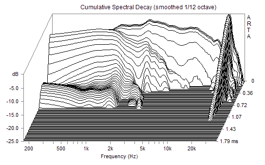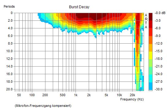 In den Zerfallspektren sind keine Störungen erkennbar - außer bei der Membranresonanz, die lange ausschwingt (über 30 Perioden à 0.04 ms = 1.2 ms).