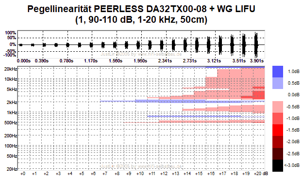 Bei einer Anregung von 84 bis 104 dB (das entspricht einer Eingangsleistung von 0.16 bis 16 Watt an 6.52 Ohm) sind bei Hochpass-Filterung (1 kHz, 12 dB/Oktave) nur ganz sporadisch Linearitätsfehler > 0.5 dB erkennbar - vor allem im Bereich der Impedanzstörstelle um 2.35 kHz.