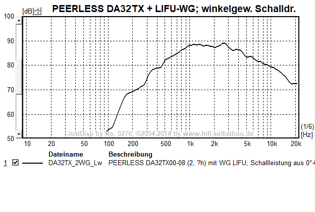 - der winkelgewichtete Schalldruck des DA32TX + LIFU-WG ist um 2.6 kHz wellig, erreicht aber bei 1 kHz die höchsten Werte hinter den Kombinationen mit dem JANTZEN-Waveguide