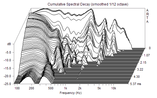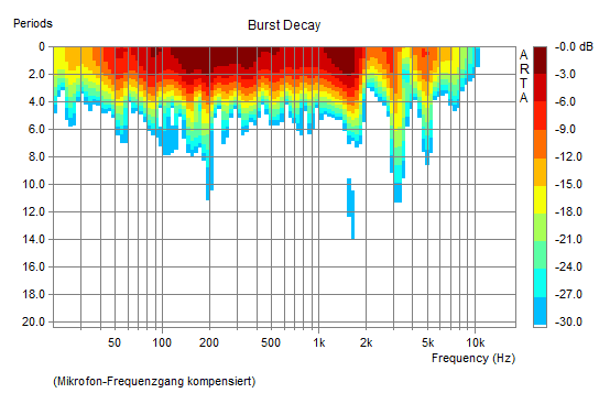 Das periodenskalierten Zerfallspektrum sieht gut aus, erst die "oberen" Membranresonanzen bei 3 und 4.8 kHz klingen etwas länger aus.