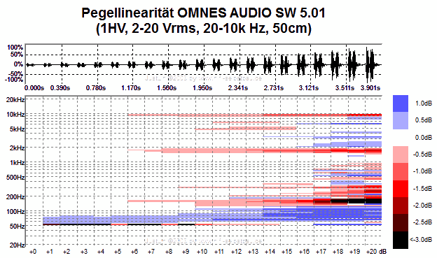 Bei einer Anregung von 1 bis 10 Volt (das entspricht einem mittleren Schalldruckpegel von 75 bis 95 dB in 1 m Abstand) sind zwischen 50 und 1600 Hz so gut wie keine Linearitätsfehler > 0.5 dB erkennbar. Erhöht man die Anregung auf 2 bis 20 Volt (= 81 bis 101 dB bzw. 1.08 bis 108 Watt) komprimiert das Chassis ab +17 dB (= 54 Watt) um 140 Hz deutlich. Da das Chassis 40 Watt Dauerlast und kurzzeitig 80 Watt "verträgt" passt das gut zusammen.