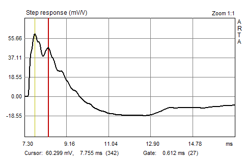 . . . verläuft auf Achse bis 1 kHz mit leicht abfallender Tendenz wie mit dem Lineal gezogen. Danach steigt der Frequenzgang bis 1.6 kHz wieder um ca. 3.5 dB. Danach fällt der Frequenzgang bis 2 kHz um gut 10 dB ab und es folgen noch 2 weitere Membranresonanzen.