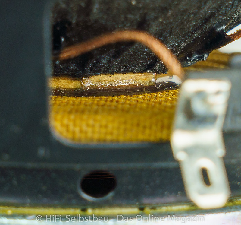 In den "Ohren" gibt es 4 Anschraubpunkte, von denen 4 breite Stege zum Magneten führen. Die 4 Öffnungen haben eine Gesamtfläche von ca. 46 cm² und sind damit deutlich kleiner als die Membranfläche. Die Zentrierspinne ist hinterlüftet, durch die Öffnungen ist erkennbar, dass der Schwingspulenträger gelocht ist und die Schwingspule ca. 5 mm über die vordere Polplatte hinausragt.