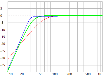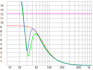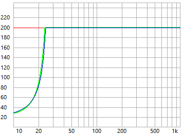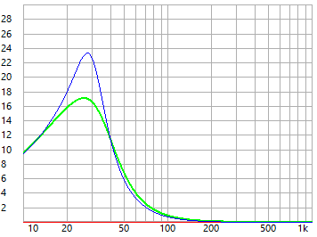 - beide Bassreflex-Abstimmungen würden bei 200 Watt unter 25.7 Hz (grün und blau) den linearen Auslenkungsbereich verlassen - hier sollte ggf. ein Hochpassfilter die Auslenkung begrenzen
