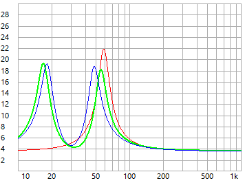 Simuliert man diese 3 Gehäuseabstimmungen mit WinISD V0.7, so ergeben sich folgende Kennwerte (gleiche Farben wie bei LASIP):
